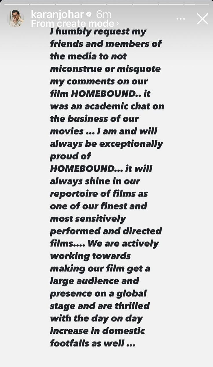 Addressing the controversy, Karan took to his Instagram story on Friday (October 10) and wrote, "I humbly request my friends and members of the media to not misconstrue or misquote my comments on our film HOMEBOUND... it was an academic chat on the business of our movies... I am and will always be exceptionally proud of HOMEBOUND... it will always shine in our repertoire of films as one of our finest and most sensitively performed and directed films."