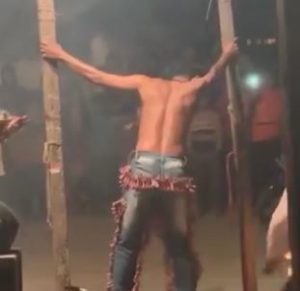 In the video, a man wearing only jeans stands between two wooden poles, holding them with his hands. Strings of firecrackers are tied to each of his legs. A large crowd gathers to witness the stunt.
